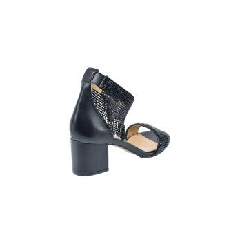 Sandalo gioiello in pelle platinata con frange di rete metallica sulla caviglia. Fascetta anteriore, tallone chiuso, plantare in lattice con sottopiede in pelle. Tacco squadrato 55 mm rivestito in metal. Suola in cuoio con base anteriore e tacco in gomma.