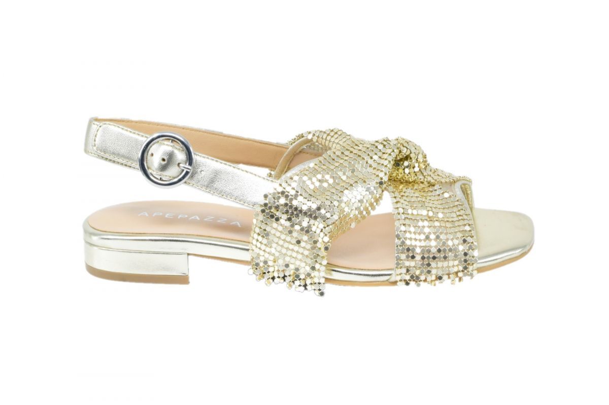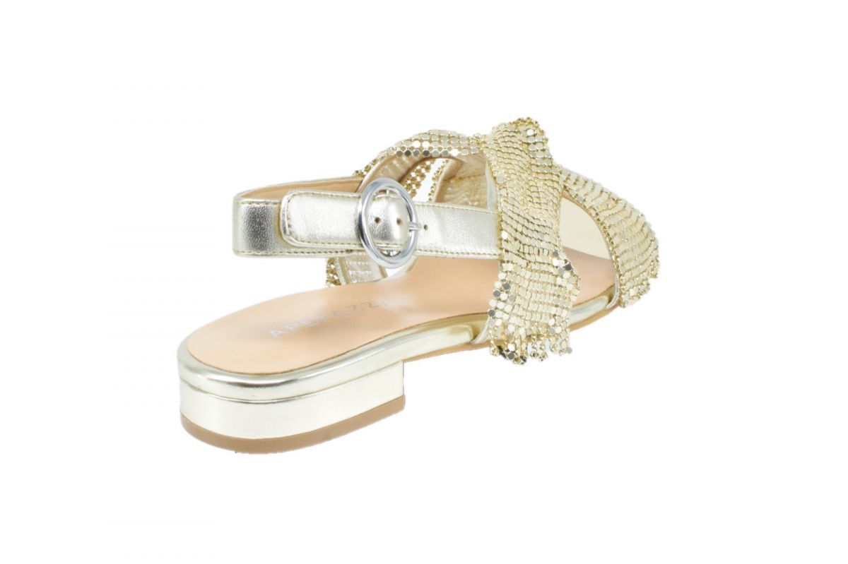 Sandalo gioiello in pelle con frange in rete metallica. Cinturino posteriore di regolazione e chiusura. Plantare in lattice e sottopiede in pelle. Punta squadrata, suola in cuoio con avampiede in gomma, tacco squadrato sporgente, altezza 30 mm.