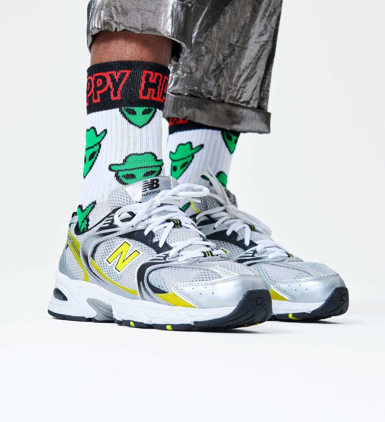 Ciao terrestri! Venite a vederci al rodeo spaziale. È la calza lavorata 3/4 Athletic Space Cowboy: un disegno retro con un'invasione di alieni pacifici, con un bel cappello.